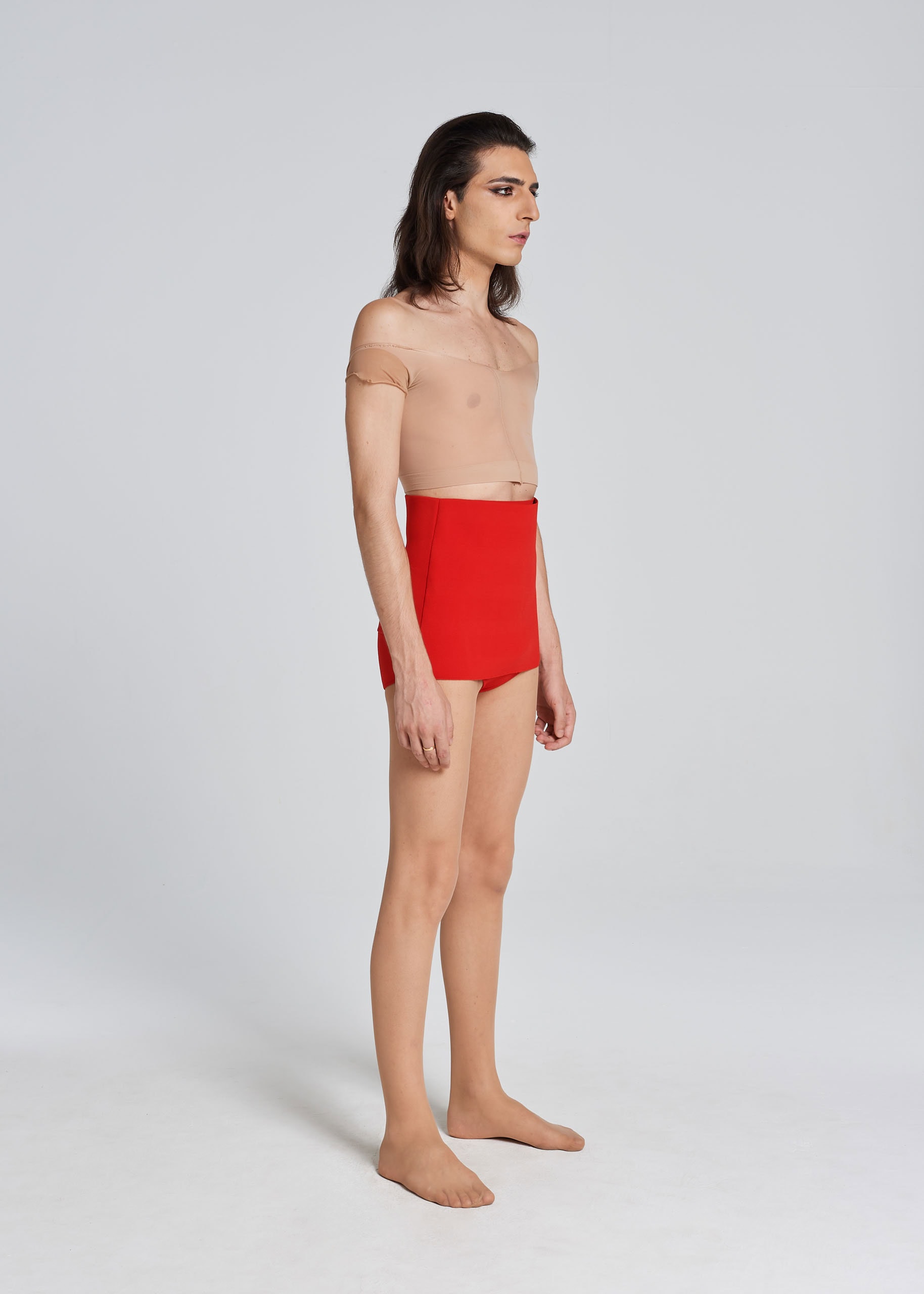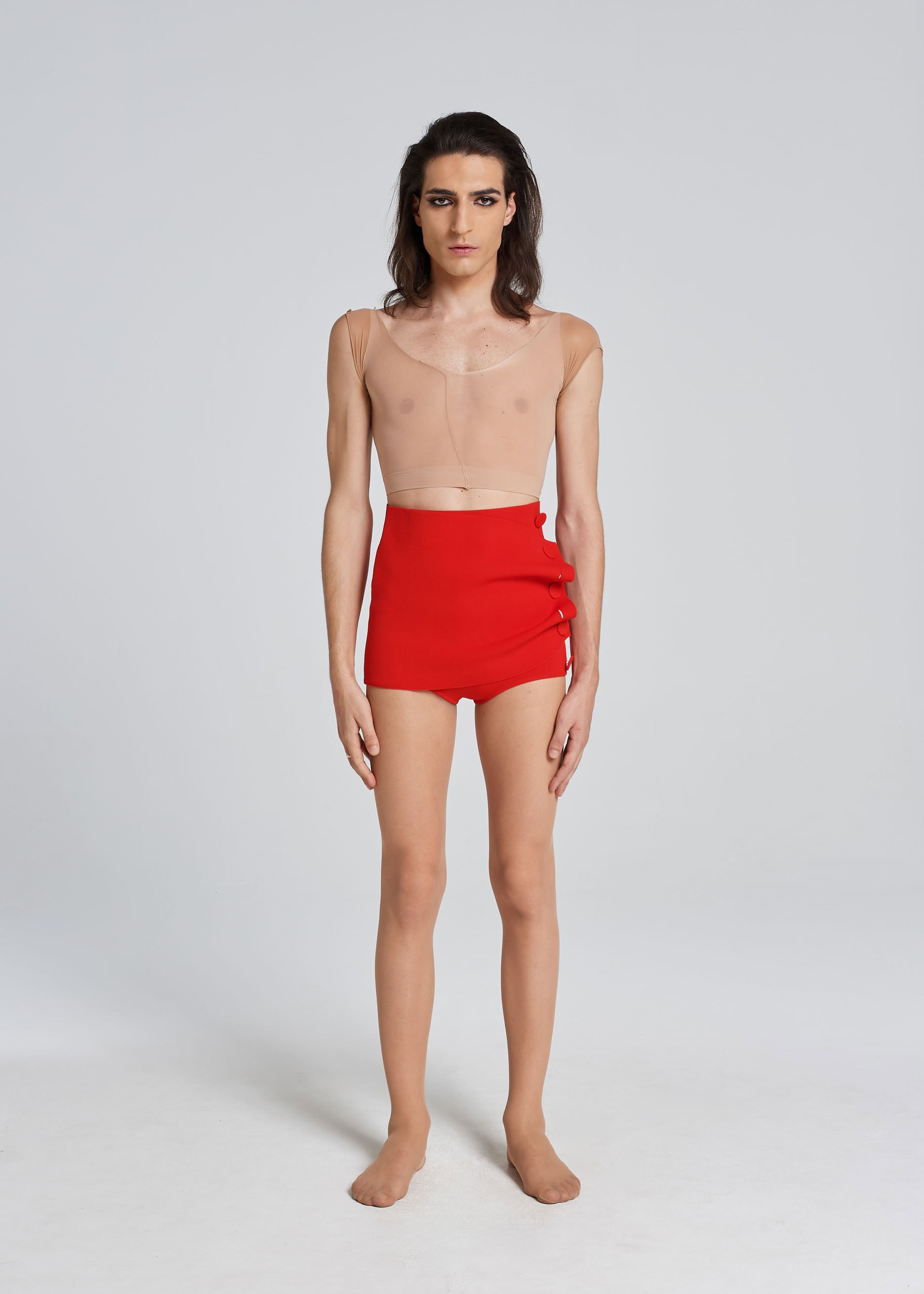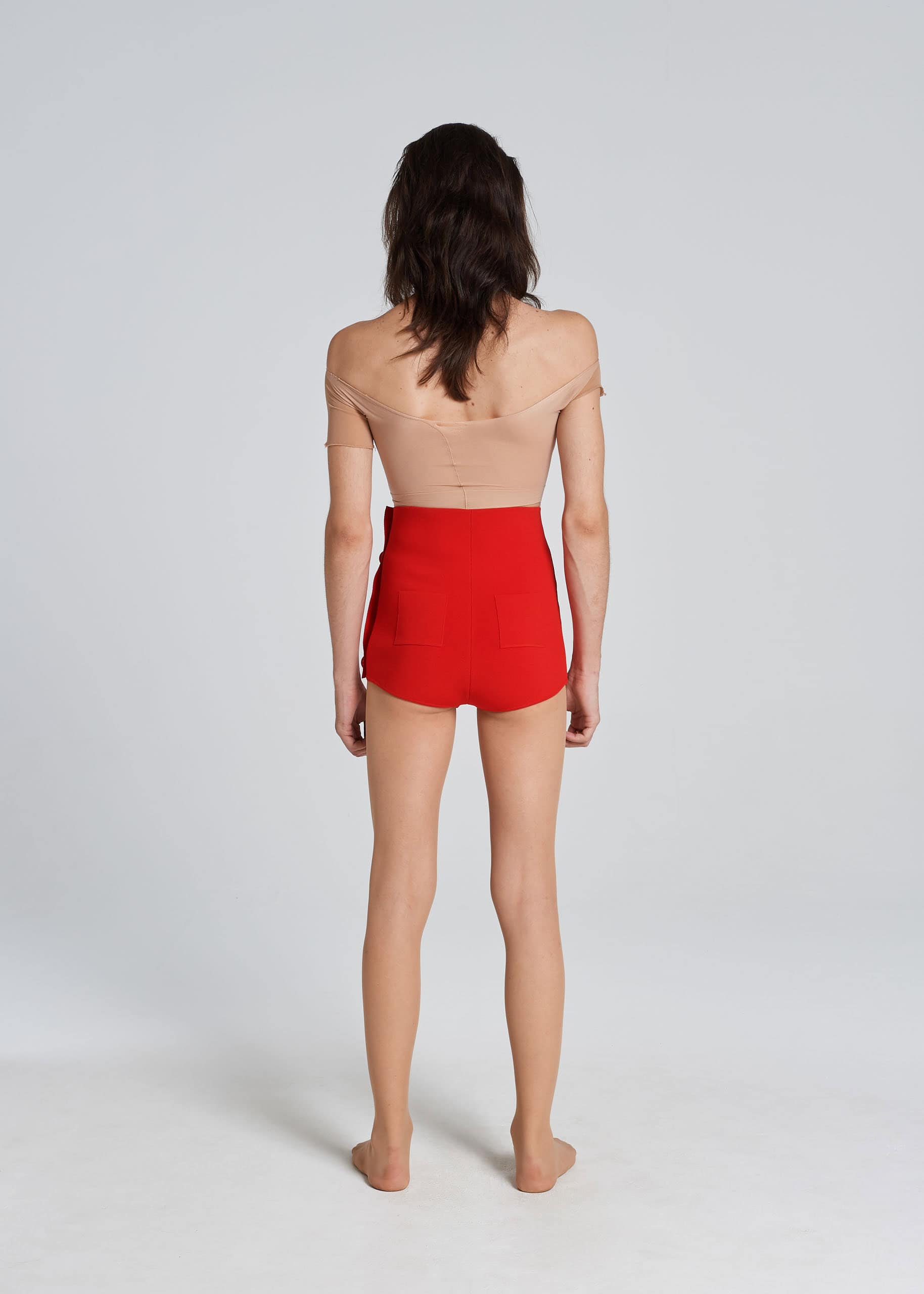 Milan stitch culotte made from stretch viscose yarn. It is constructed with two panels: the second one covers the first one and buttons up the side. You can close it tightly or haphazardly, as usual. All closed it makes a little mini skirt, a little bon ton, but also a tennis skirt. Set with the Bipolar Bralette, then, it makes super Challengers. Buttoned up haphazardly, however, it becomes much sexier and ROT. The buttons are extra large and covered with the same thread. It is comfortable, stretchy, suitable for raves or Wimbledon tournaments. ROT goes to the beach with this culotte and bralette set.