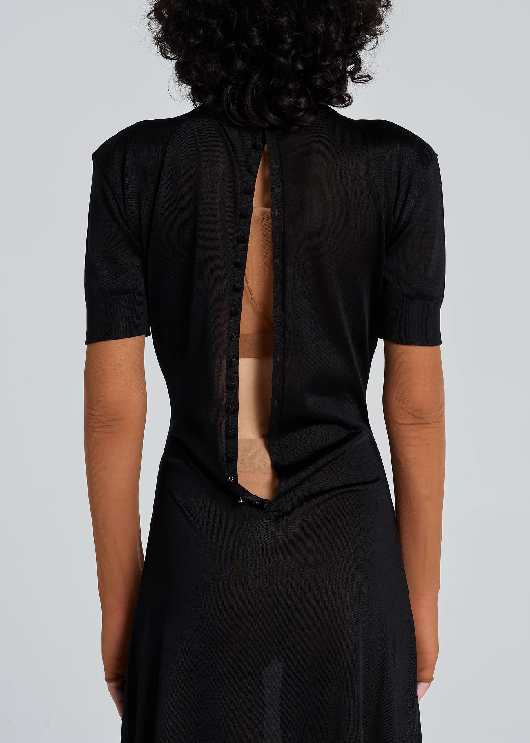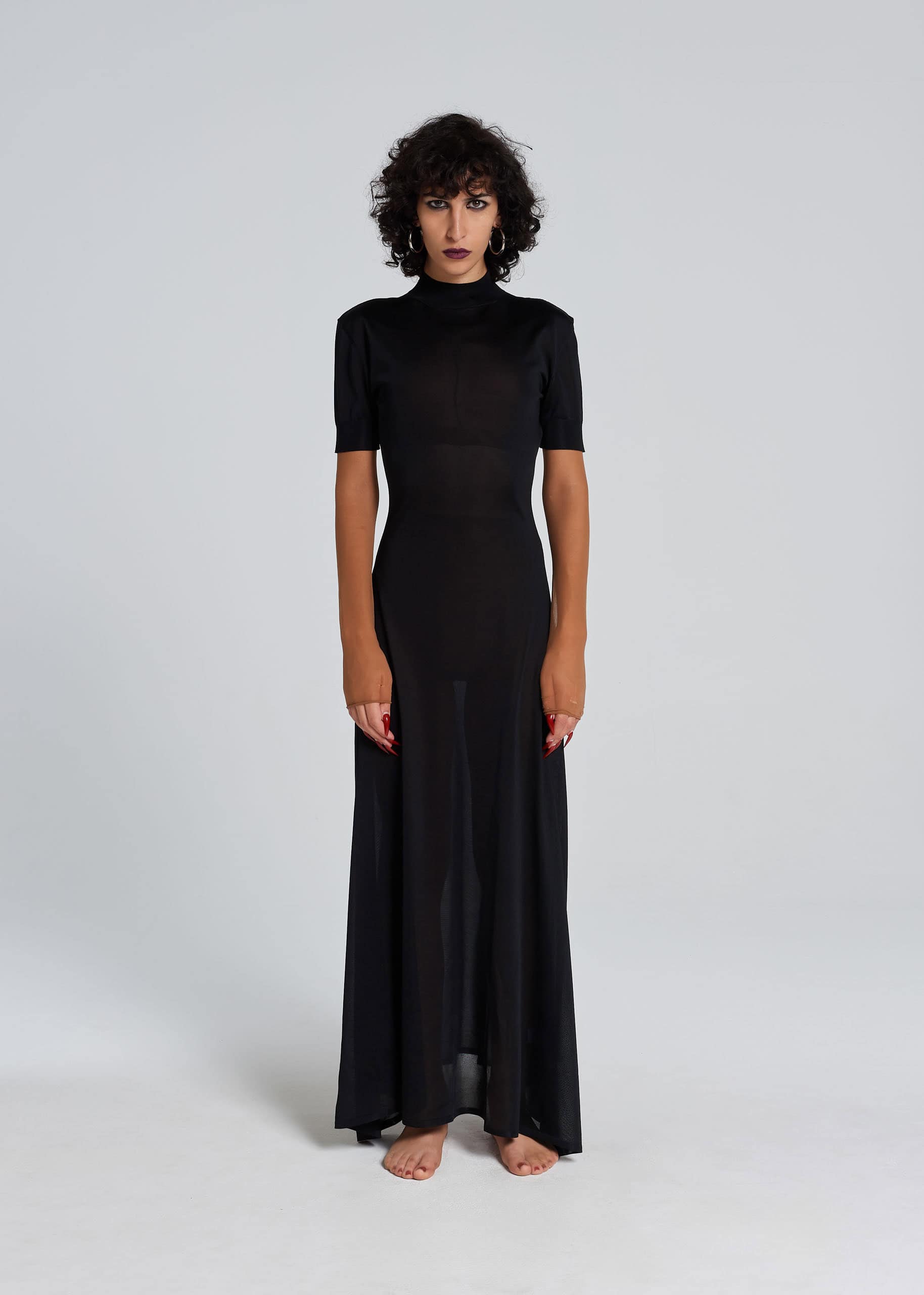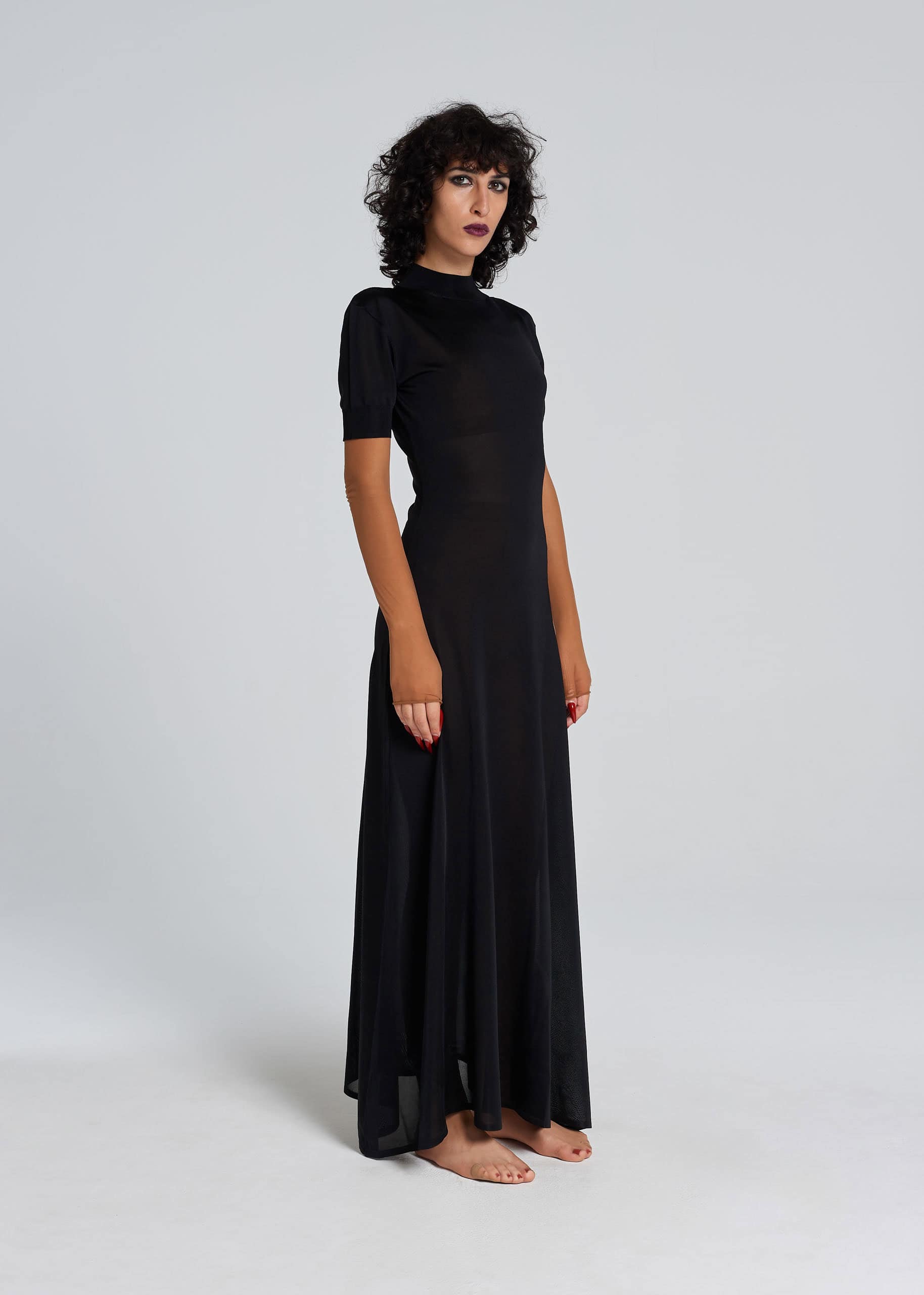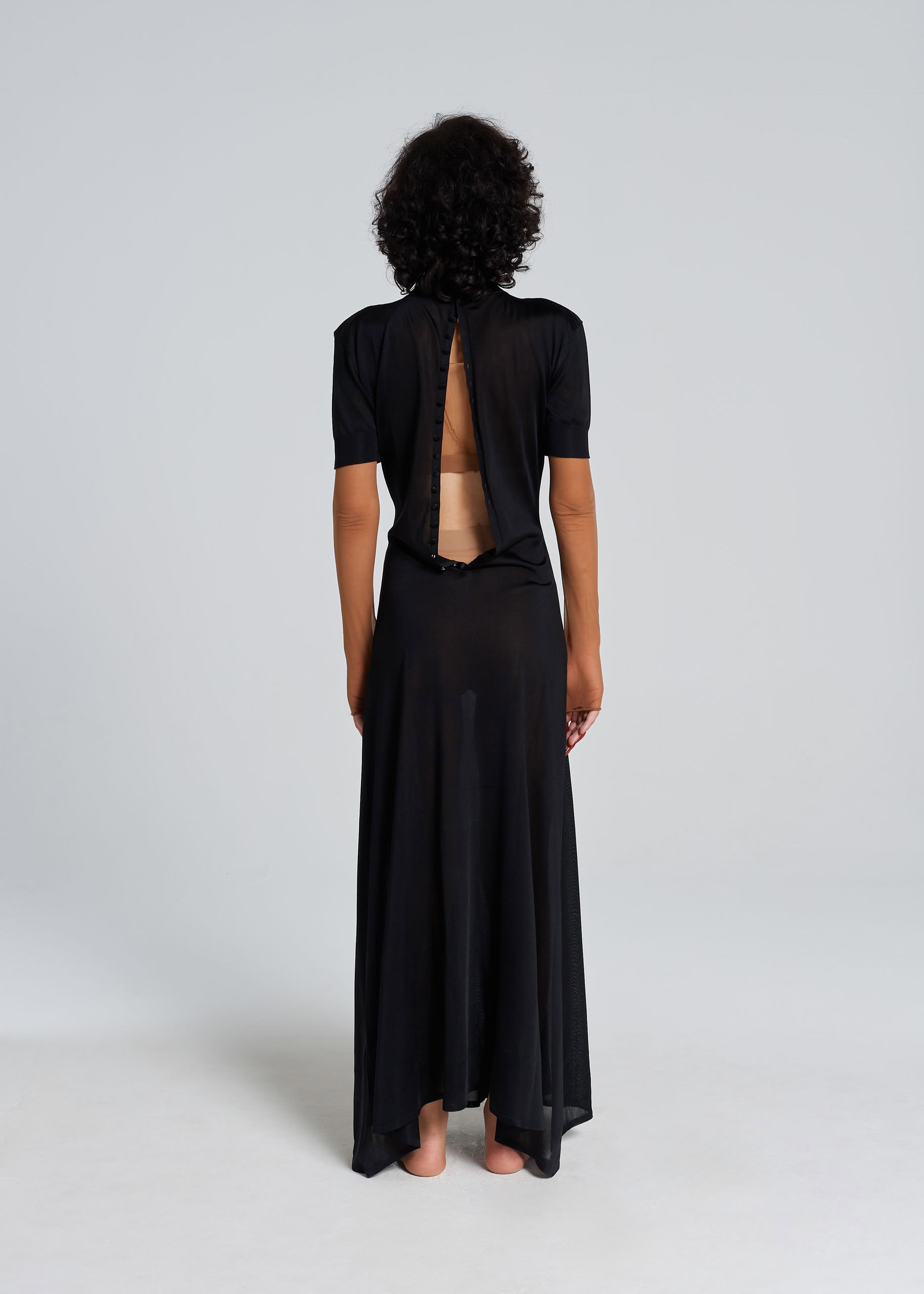 Abito lungo e (non più molto) casto, di filo di pura seta, da cui traspare la silhuette in controluce, con la giusta dose di malizia. La linea è morbida sulla parte superiore e si allarga in fondo. Sul retro, una profonda apertura permette di spogliarsi all’istante nelle sere bollenti d’estate. I bottoni sono ricoperti dello stesso filo di pura seta.