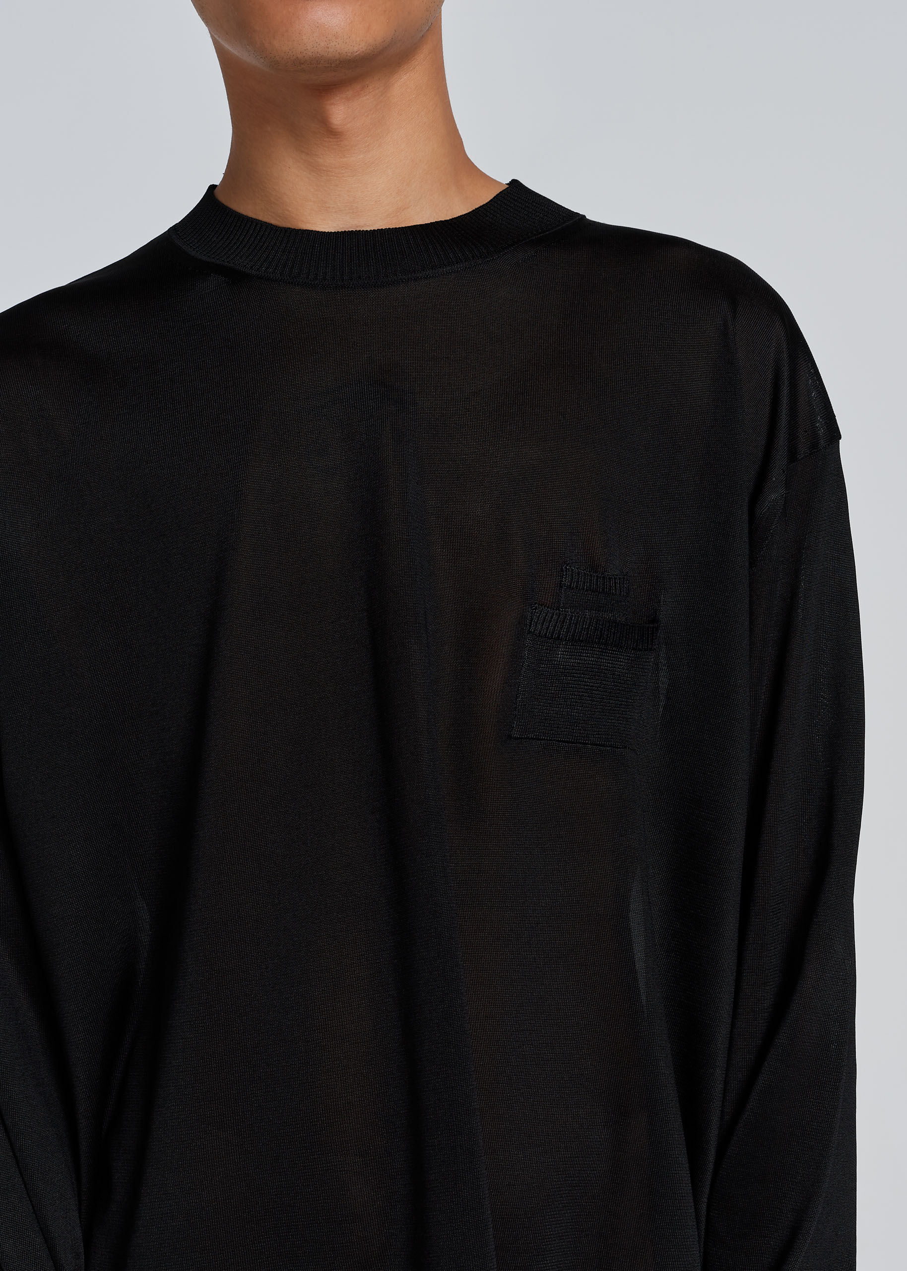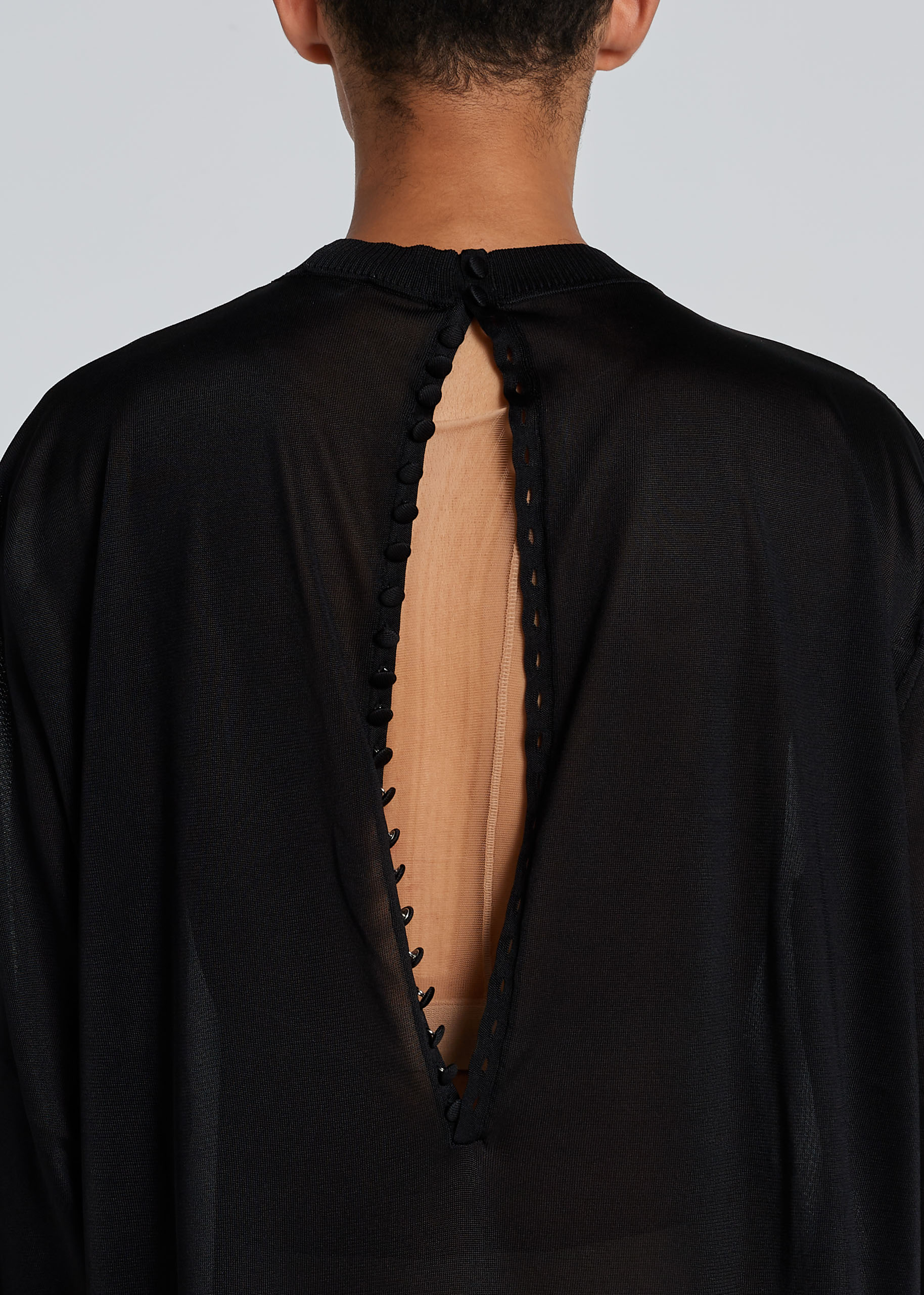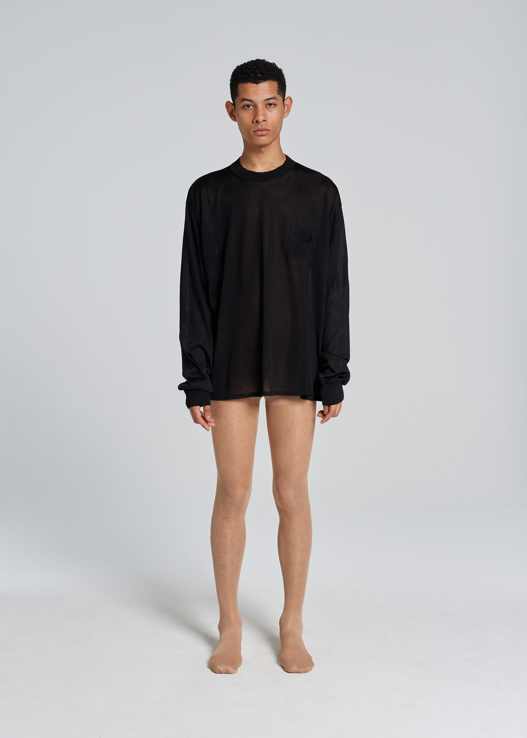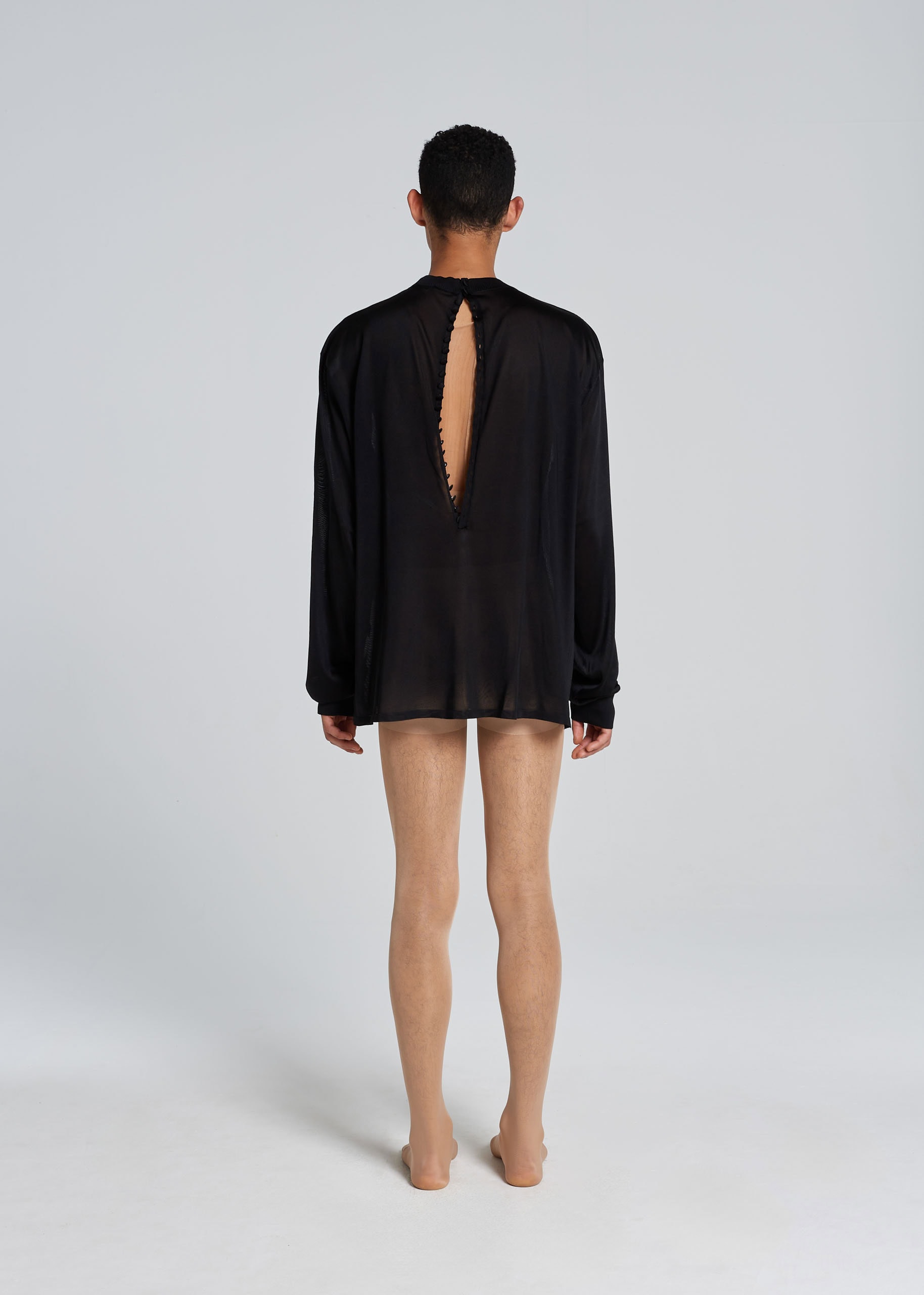 La T-shirt di ROT è in filo di pura seta, e ha una scollatura vertiginosa che puoi giocarti sul davanti e sul retro. Il modo migliore di allacciarla? A caso. I bottoni sono ricoperti dello stesso filo. Ha due microtasche in seta progettate per non perdere le microdosi. Puoi indossarla come una casta maglia a maniche lunghe, e trasformarla in un capo tremendamente sexy. Vedi tu come te la senti.