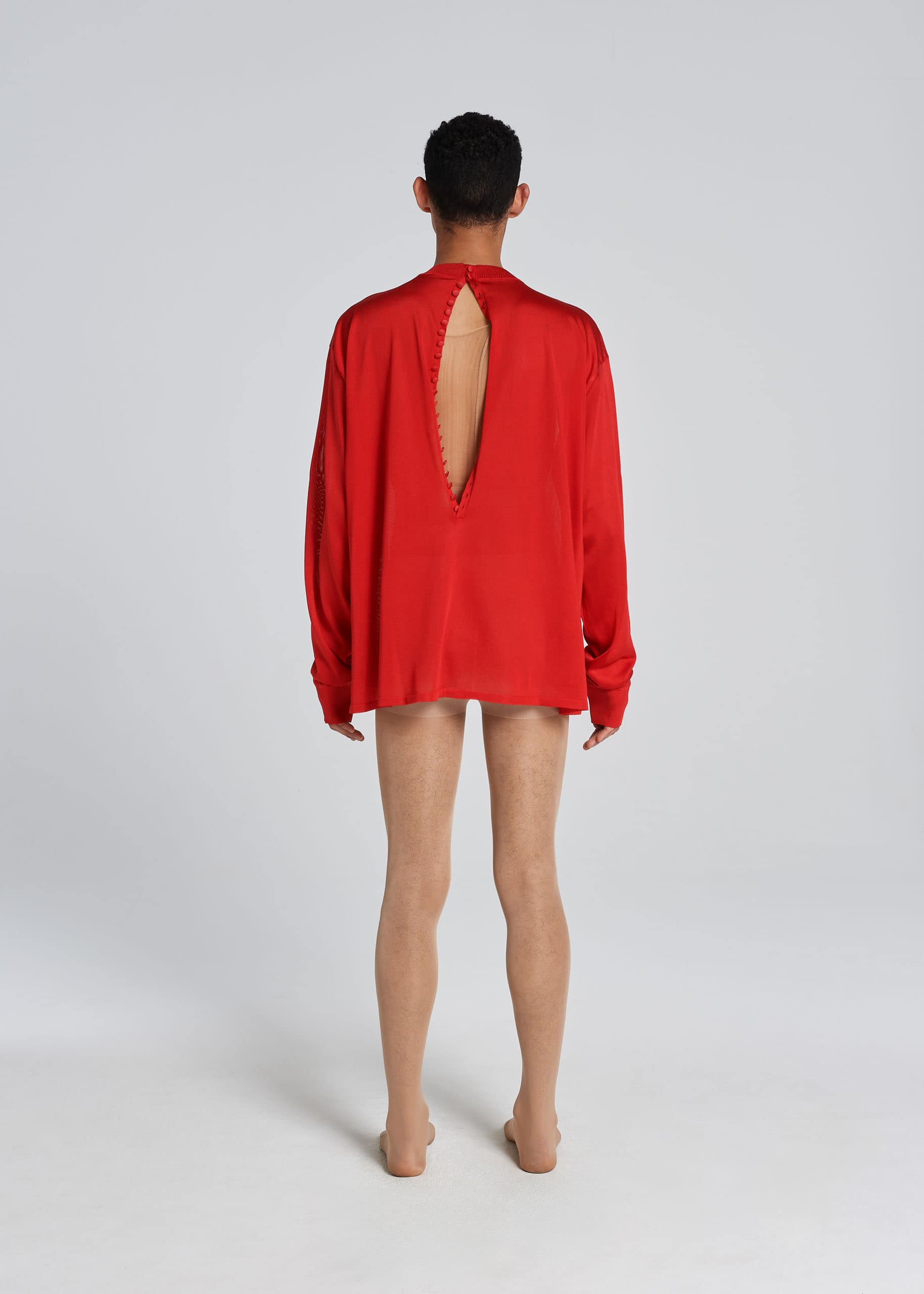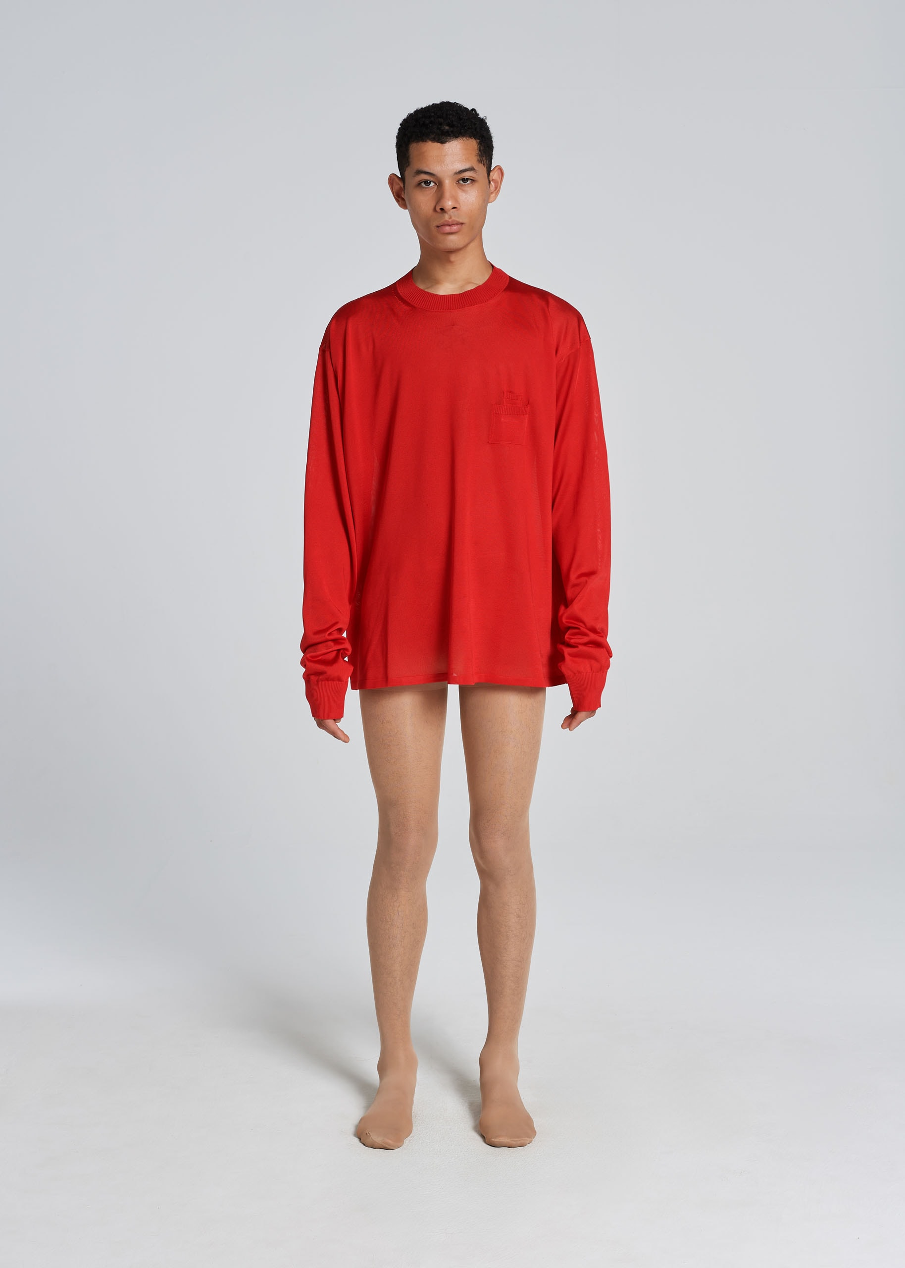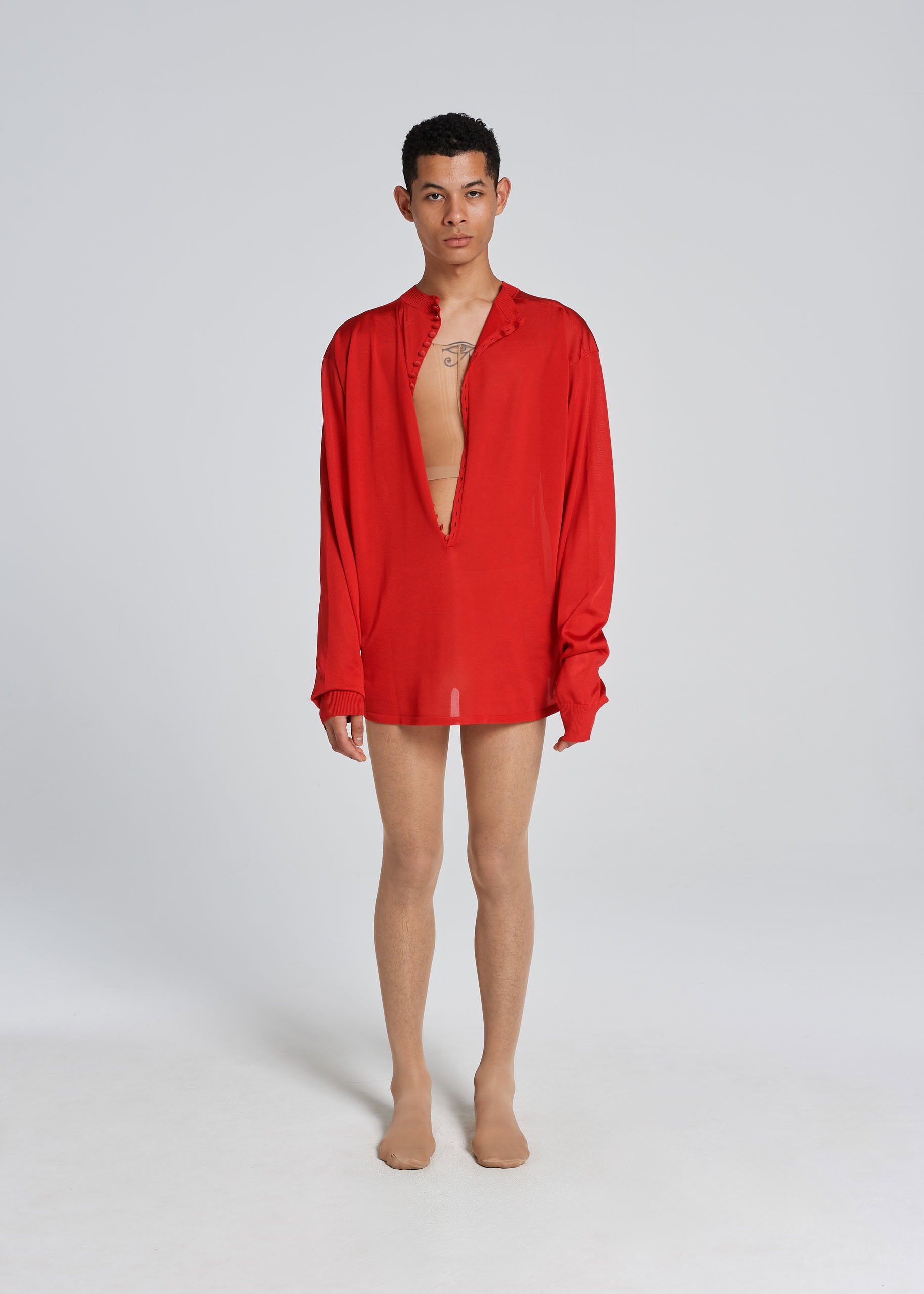 La T-shirt di ROT è in filo di pura seta, e ha una scollatura vertiginosa che puoi giocarti sul davanti e sul retro. Il modo migliore di allacciarla? A caso. I bottoni sono ricoperti dello stesso filo. Ha due microtasche in seta progettate per non perdere le microdosi. Puoi indossarla come una casta maglia a maniche lunghe, e trasformarla in un capo tremendamente sexy. Vedi tu come te la senti.