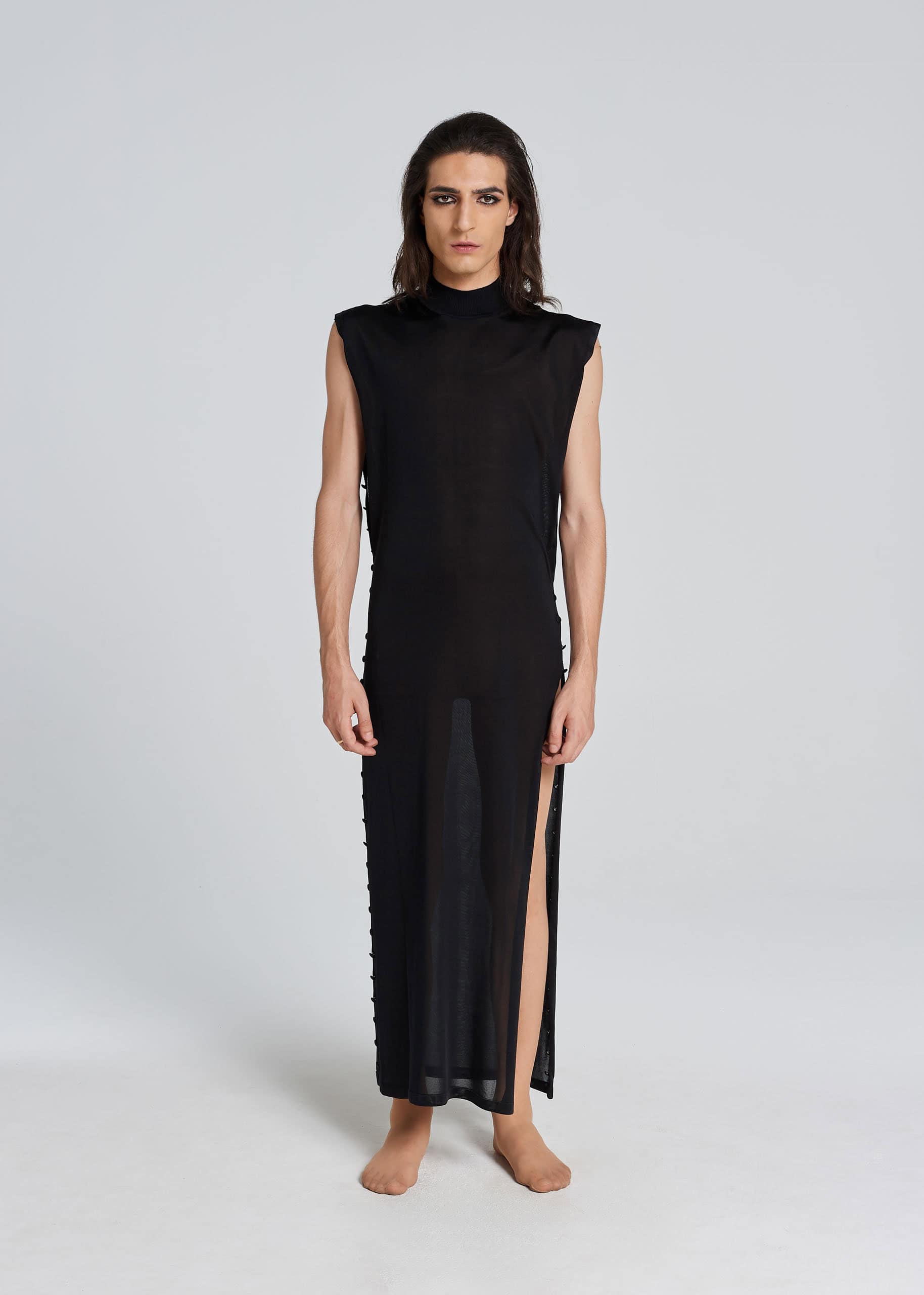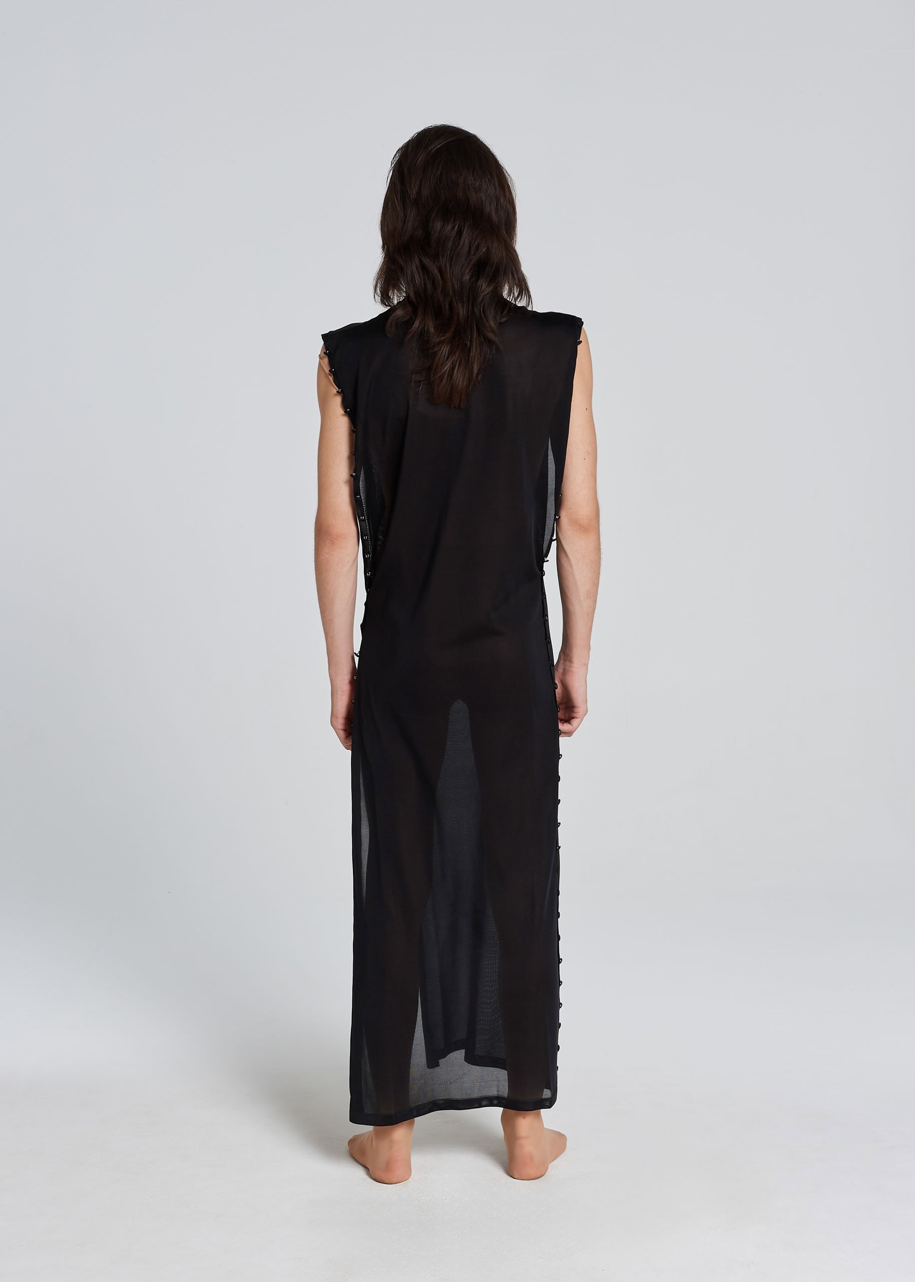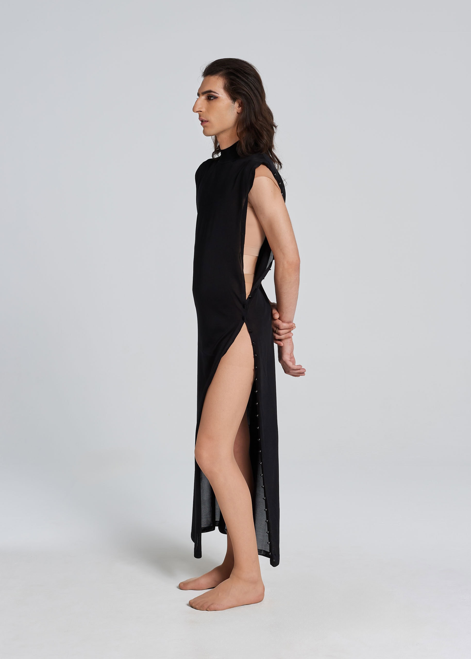 Abito in filo di pura seta completamente aperto su entrambi i fianchi, e una cascata di bottoni ricoperti dello stesso filo da chiudere come vuoi. Abbottonali tutti per sembrare una vestale nel tempio. Lasciali tutti aperti per coprirti con un mantello da vampiro. Oppure chiudili del tutto a caso su un lato, e sull’altro pure, per ottenere il nostro styling preferito: perché vestale sì, ma al Kitkat. Achtung: il collo è leggermente alto e un po’ scomodo da infilare (perché alla Gabri i colli piacciono così).